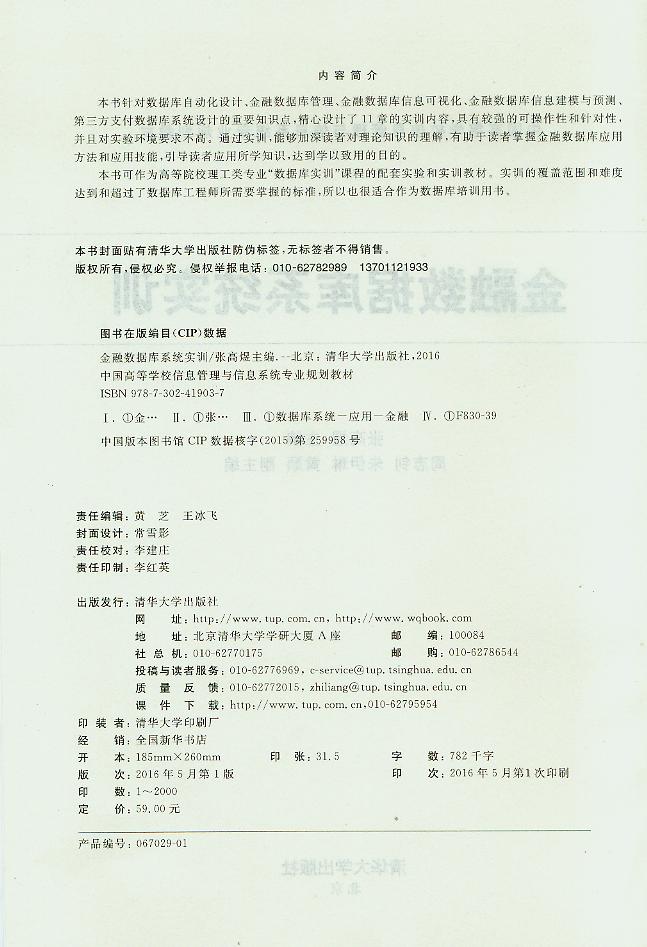 本书是国内第一本将数据库与金融数据可视化、金融数据分析、第三方支付结合在一起,并进行详细阐述的实训教材,全书从锻炼读者的应用能力入手,设计了数据库自动化设计实训、金融数据建模预测实训、B/S和C/S模式的第三方支付平台设计实训,同时兼顾理论介绍,详细分析了第三方支付系统的总体需求设计、ORACLE大型数据库管理技术。