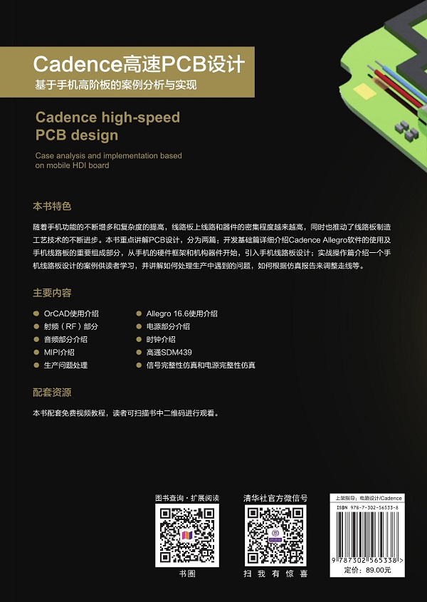 前言 随着网络的普及和人们沟通效率的提高,手机已经成为人们日常生活、户外出行必备的工具。在地铁、汽车、餐厅到处可以见到大家通过手机聊微信、打电话、上网的场景,人们对手机的依赖性增强,同时也促使手机的设计水平不断地提高。 近些年来,EDA在国内发展得很快,人才的需求也越来越大,特别是随着5G的普及,高密高阶板设计的EDA工程师严重缺乏,已经出现了EDA工程师薪资高于硬件工程师的趋势。一个优秀的EDA工程师需要有全面的知识结构,不仅要了解电子方面自身工作需要的知识,还要有机械安装、机械制图、线路板生产、贴片、测试以及软件方面的知识储备,属于多知识面结合的复合型人才。EDA设计是实践性很强的工作,EDA工程师最重要的是在设计规则中积累经验。为了提高学习的实用性效率,本书按照EDA工程师具体的工作流程安排章节,避免了菜单式的讲解。 本书分为两篇,开发基础篇(第1~9章)详细介绍Cadence Allegro软件的使用及手机线路板的重要组成部分,从手机的硬件框架和机构器件开始,引入手机线路板设计; 实战操作篇(第10~13章)介绍一个手机线路板设计的案例供读者学习,并讲解EDA工程师如何处理生产中遇到的问题等。 在开发基础篇,第1章介绍手机的基本组成及常用的硬件模块、传感器、结构组件。第2章介绍线路板和EDA的基础知识,让读者更快进入实践学习中。第3章详细讲解OrCAD的使用方法,包括元器件库管理、原理图放置Part、原理图编辑和工程文件管理、输出方法。第4章是本书的重点,系统讲述Allegro的使用方法,包括PCB元器件库管理、Padstack建立和新建各种 Pac...