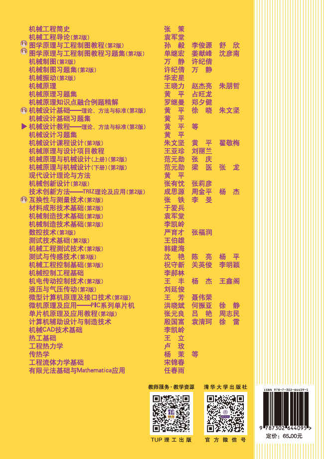 第2版前言 《机械设计教程——理论、方法与标准》第2版是在第1版的基础上,根据作者多年在机械设计课程教学中的经验和读者反馈进行调整、修改而成的。 本书第2版基本上保留了第1版的系统框架,共分18章。除了修改了前版的一些错漏,更新了国家标准外,主要修订的内容还包括: (1) 将原来第14章的内容提到第1章。其目的一是使学习者初学伊始就对机械设计有一个整体的了解。二是为开设系列习题做铺垫。 (2) 如前所述,本版将课程设计中常做的二级展开式齿轮减速器设计作为系列习题分散在第1、5、6、7、9、10、13章,以加强学生对机械设计中各零件设计之间联系的认识。 (3) 将原来18.2节的设计题目的内容提前到第14章中。 (4) 除了增加的系列习题外,还更换了大部分的习题,包括: 判断题、选择题、问答题、计算题和结构题等。 (5) 为了更好地利用已有的网络资源,本版通过二维码的形式将所有附录、理论和实验教学视频制作成网上资源供学习者通过扫描查询和学习。借助教材和电子资源,读者完全可以自学本书的主要内容。 参加本版主要编写工作的是王慰祖和王亚珍。孙建芳为本版的附录内容提供了最新国家标准资料。王文萍对第14~18章的内容做了审核与修订。黄平负责全书的最终审定。参加视频录制的有: 黄平、陈扬枝、翟敬梅、徐晓、李旻、孙建芳、何军、冯梅、刘新育和何亚农。 我们希望通过本版的修订使本书内容更加完善。我们也充分认识到,随着科学技术的不断发展,必将给机械设计内容增加更新和更多的内容。因此,本书必然存在改进之处,敬请广大读者批评指正。 最后,...