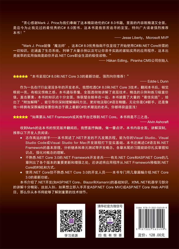 《C#8.0和.NET Core 3.0高级编程》使用当前最流行的Visual Studio Code编辑器开展编程任务,对上一版内容进行了全面的更新和扩展,新增了两章专门介绍内容管理系统(CMS)以及如何使用ML.NET进行机器学习。