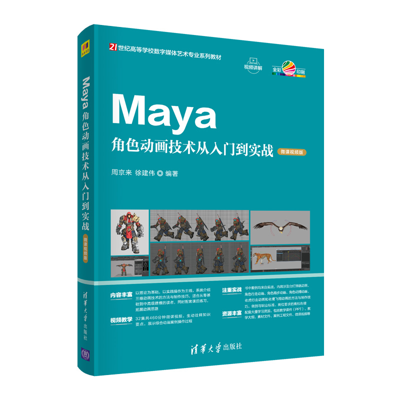 Maya 角色动画技术从入门到实战 微课视频版 II ●实用技能为核心 本书案例选材主要从适应当前社会应用型人才的需求出发,以实用技能为核心,将动画 技术的理论知识和真实企业三维动画的实践案例紧密结合。本书注重通过丰富的项目案例来 帮助读者更好地学习和理解三维动画的相关知识和应用技巧。本书涉及的案例主要有小球基 础动画、台灯弹跳动画、角色Pose设计、角色行走动画、角色跑步动画、老虎行走动画、老 鹰飞翔动画、角色动捕数据动画应用。 ●创新原则 本书及时根据新技术、新标准、新规范等更新编写内容,图文并茂,每章案例都配有视 频教程,语言生动,突出前沿,着力打造精品。采用五维一体教学法中的“项目实践法”的 教学方式。案例中设计了很多技巧提示,读者不仅可以快速掌握一定的实战经验,而且可以 快速掌握三维动画的制作技巧。 二、配 套 资 源 ●教学课件(PPT)、教学大纲、素材文件、案例工程文件等资料,可扫 描此处二维码下载或者到清华大学出版社官方网站本书页面下载。 ●微课视频(460分钟,32集),可扫描正文中各章节相应位置的二维码观看。 三、致 谢 本书由资深动画师周京来负责全书统稿,编写第4~8章,并制作配套的教学文件、素材 文件及每章案例的视频教学文件;由石家庄工程职业学院的徐建伟老师编写第1~3章。 本书能够顺利出版要感谢我的父母、家人、领导和朋友们的支持与鼓励,特别感谢精英 集团、精英教育传媒集团、河北传媒学院、石家庄工程职业学院、河北天明传媒有限公司、 北京精英...