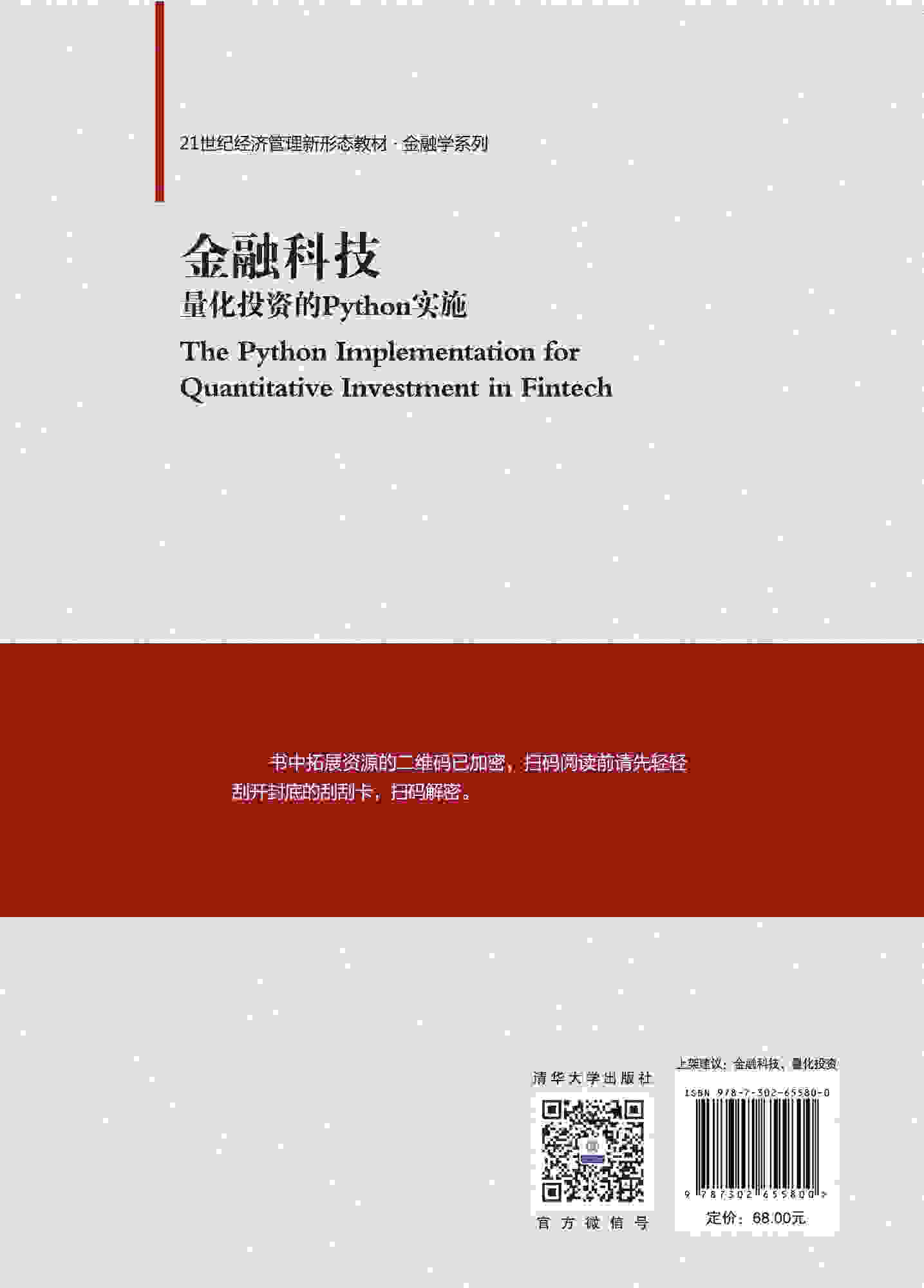 前言 量化投资是指投资者以投资数据为基础,以优化和统计等数学模型为核心,结合现代金融投资理论(金融市场及机构、公司金融、投资学、金融工程等),将自己在金融市场中的实践经验或感悟通过优化、统计等数理模型进行量化,设计出相应的交易规则,最后运用计算机系统自动地按照交易规则进行程序化交易。量化投资在各类金融机构与监管部门中都有广泛的应用。随着信息科技的普及、金融计量方法的蓬勃发展以及金融衍生工具的多样化选择,金融科技与量化投资正在快速发展,掀起一股热潮。金融市场特别是基金和证券行业对金融科技与量化投资人才的需求逐年攀升,但市场上这方面的人才却十分匮乏。金融科技作为一门新兴交叉学科,目前国内尚缺乏相应的教学辅导资料,许多高等学校对这一门学科的建设也缺乏经验,甚至在国内高等教育是一个空白。鉴于此,我们编写了这本《金融科技——量化投资的Python实施》,以适应金融科技与量化投资专业创新型人才培养的知识结构要求。 本书以Python语言、BigQuant量化投资平台、Backtrader量化交易软件等为基础,利用我国的实际数据给出金融投资方法与策略的Python应用,因而具有很好的实用价值。本书实例与内容丰富,有很强的针对性,书中各章详细地介绍了实例的Python具体操作过程,读者只需按照书中介绍的步骤一步一步地实际操作,就能掌握全书的内容。为了帮助读者更加直观地学习本书,我们将书中实例的全部数据文件提供给读者(可扫书末二维码获取)。读者在本地计算机中建立一个/2glkx/data目录(其他目录名也可以),将所有数据文件复制到此目录,即可进行操作。部分策略在BigQ...