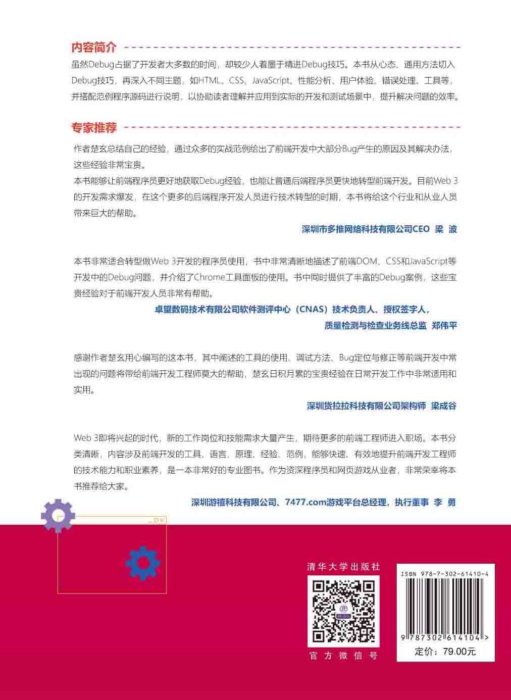 掌握Debug(调试和故障排除)技术是编程人员重要的能力之一。本书作者将多年积累的开发经验浓缩到本书精心设计的教案中,通过范例网站和程序代码讲解HTML、DOM和CSS、JavaScript、性能分析、用户体验、错误处理等开发过程中遇到的问题的成因和解决方法,帮助读者从心态、通用方法切入Debug技巧,再深入至不同主题。相信读者在阅读本书之后,能够更好地掌握Debug工具,将学到的Debug技能应用到实际的开发和测试工作中,并大幅提升解决问题和开发的效率。 本书适用于前端初学者、前端工程师以及有经验的开发者。