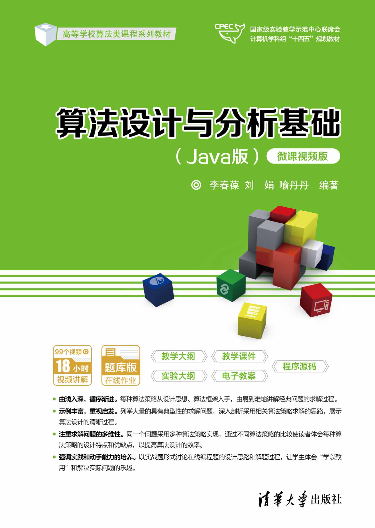 前言 党的二十大报告中指出:教育、科技、人才是全面建设社会主义现代化国家的基础性、战略性支撑。必须坚持科技是第一生产力、人才是第一资源、创新是第一动力,深入实施科教兴国战略、人才强国战略、创新驱动发展战略,这三大战略共同服务于创新型国家的建设。高等教育与经济社会发展紧密相连,对促进就业创业、助力经济社会发展、增进人民福祉具有重要意义。 用计算机求解问题是将特定问题的求解过程转换为计算机可以执行的程序,能够设计好的程序是计算机专业学生的基本功。在计算机教学体系中编程类的主要课程有“高级程序设计语言”“数据结构”“算法设计与分析”等,这些课程相互承接,程序设计语言是求解问题的工具,数据结构是求解问题的基础,算法设计是求解问题的关键。 “算法设计与分析”课程是计算机科学与技术等专业的必修课,旨在通过学习理解掌握算法设计的主要策略和算法复杂性分析的方法,并能熟练运用各种数据结构和常用算法策略设计高效算法,培养学生分析问题和解决复杂工程问题的能力,为学生进一步学习后续课程奠定良好的基础。本书是编者长期从事“数据结构”与“算法设计与分析”课程本科生和研究生教学中的经验总结,凝聚了编者的教学体会和理念。 1. 本书内容全书由9章构成,各章内容如下。 第1章算法入门——概论: 介绍算法的概念、算法描述方法、算法设计步骤和算法时空分析方法。 第2章工之利器——常用数据结构及其应用: 结合Java中的各种集合介绍线性表、字符串、栈、队列、双端队列、优先队列、树和二叉树、图、并查集、二叉排序树和平衡二叉树、哈希表等数据结构的原理和应用。 第3章必备技能——基本算法设计方法: 介...