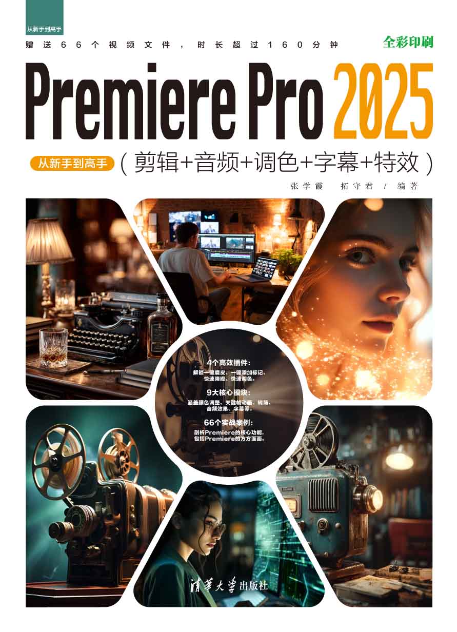 前 言 在数字化浪潮的推动下,视频创作已成为个人表达、商业传播和艺术创作的核心载体。Adobe Premiere Pro 2025作为行业领先的专业剪辑工具,凭借其强大的功能迭代与智能化设计,持续赋能创作者突破技术边界,释放创意潜能。它不仅能够满足专业剪辑师的需求,也为初学者提供了友好的操作界面和便捷的学习途径。 本书以“基础技能+高级技巧+实战应用”为核心框架,在详细讲解软件基本操作的同时,让读者跟着一起实战演练,以边学边做的形式体验视频制作的乐趣。 本书特色 66个实战案例贯穿,技能全覆盖:本书通过66个实操案例,深度解析Premiere Pro 2025的核心功能,涵盖基础剪辑、高级特效、调色合成、音频处理等全流程操作,实现从零基础到综合案例实战的无缝衔接。 9大核心模块精讲,构建专业体系:全书以“操作基础→素材处理→高级技巧→综合输出”为脉络,系统讲解软件基础、工具解析、剪辑基础、颜色调整、关键帧动画、音频处理等9大模块,帮助读者搭建完整的影视后期知识框架。 4个高效插件,解锁专业级效果:除Premiere Pro原生功能外,本书特别引入行业级插件提升创作效率与视觉效果。Beauty Box一键磨皮,Neat Video消除噪点,MojoⅡ快速调色,Beat Edit一键为音频添加标记。 内容框架 本书基于 Premiere Pro 2025编写而成,鉴于官方软件每年会进行不同频次的更新,建议读者根据自身使用的版本灵活地进行适应性学习。 本书对视频素材剪辑、音频处理、视频特效应用等内容进行了详细讲解,全书共10章,具体内容如下所述。 第1章:新手入门...