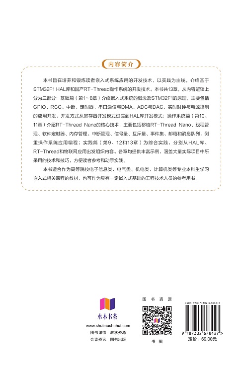 本书的适用对象广泛,可作为高等学校各专业本科生电子科学技术、自动化、机电一体化、物联网等专业嵌入式课程的教材,也适用于对STM32微控制器及RTT操作系统感兴趣的广大读者阅读。