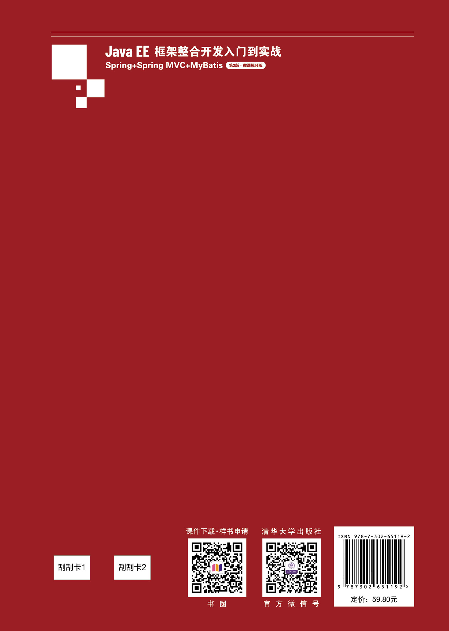 前言 本书适合具有 Java编程基础和一定的 Java Web相关知识的读者学习。 本书使用 Spring Framework 6.0 + MyBatis 3.5.11详细讲解了 SSM三大框架的基础知识和使用方法。本书的重点不是简单地介绍三大框架的基础知识,而是精心设计了大量实例。读者通过学习本书可以快速地掌握 SSM框架的实践应用,提高 Java EE应用的开发能力。 本书是第 2版,使用 Spring Framework 6.0 + Tomcat 10编写实例。与第 1版相比,本书删除了类型转换、格式化等内容,增加了 Spring Test单元测试内容,合并了 MyBatis的相关章节,调整了部分章节的顺序。全书共 17章,各章的具体内容如下: 第 1章主要讲解 Spring框架的一些基础知识,包括 Spring框架的体系结构、核心容器、开发环境及入门程序等内容。 第 2章主要介绍 Spring IoC的基本概念、 Spring IoC容器及依赖注入的类型等内容。 第 3章对 Spring中的 Bean进行详细介绍,主要包括 Spring Bean的配置、实例化、作用域、生命周期及装配方式等内容。 第 4章主要介绍 AOP的相关知识,包括 AOP的概念和术语、动态代理、 AOP的实现以及 AspectJ的开发等内容。 第 5章主要介绍 Spring框架所支持的事务管理,包括编程式事务管理和声明式事务管理。 第 6章主要讲解 Spring MVC的设计思想以及 Spring MVC的工作原理。 第 7章详细讲解基于注解的控制器,包括 @Contro...