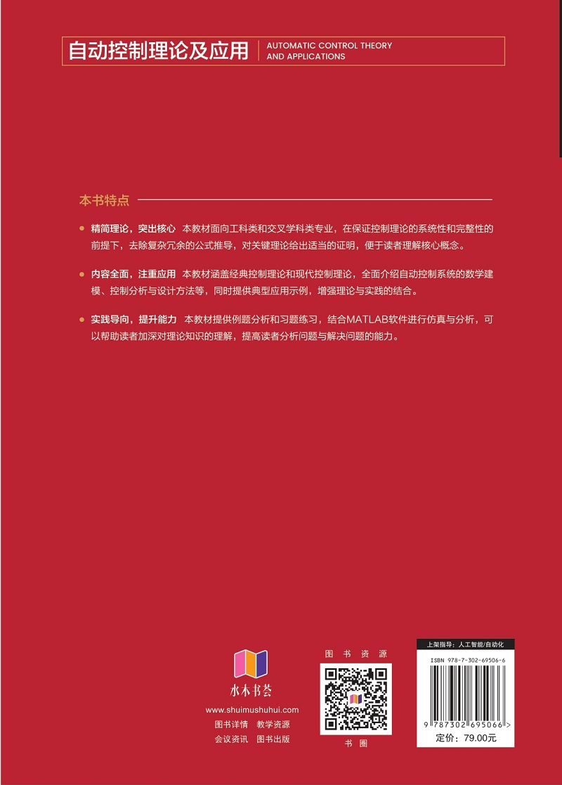 内容全面,注重应用  本教材涵盖经典控制理论和现代控制理论,全面介绍自动控制系统的数学建模、控制分析与设计方法等,同时提供典型应用示例,增强理论与实践的结合。