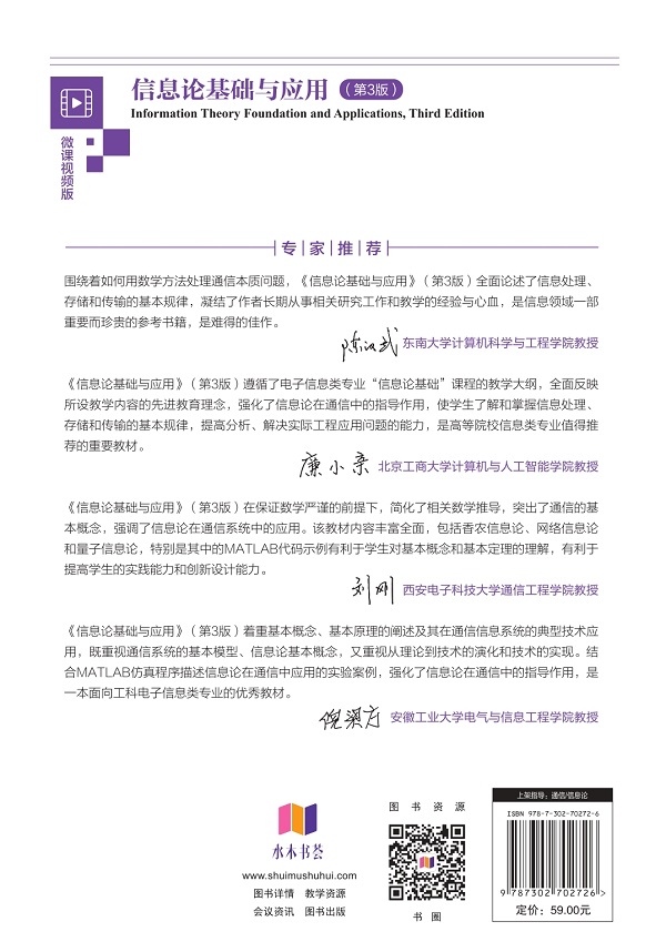 ?遵循电子信息类专业的教学要求,力求全面涵盖“信息论”课程的教学知识点,并反映信息论的**发展;