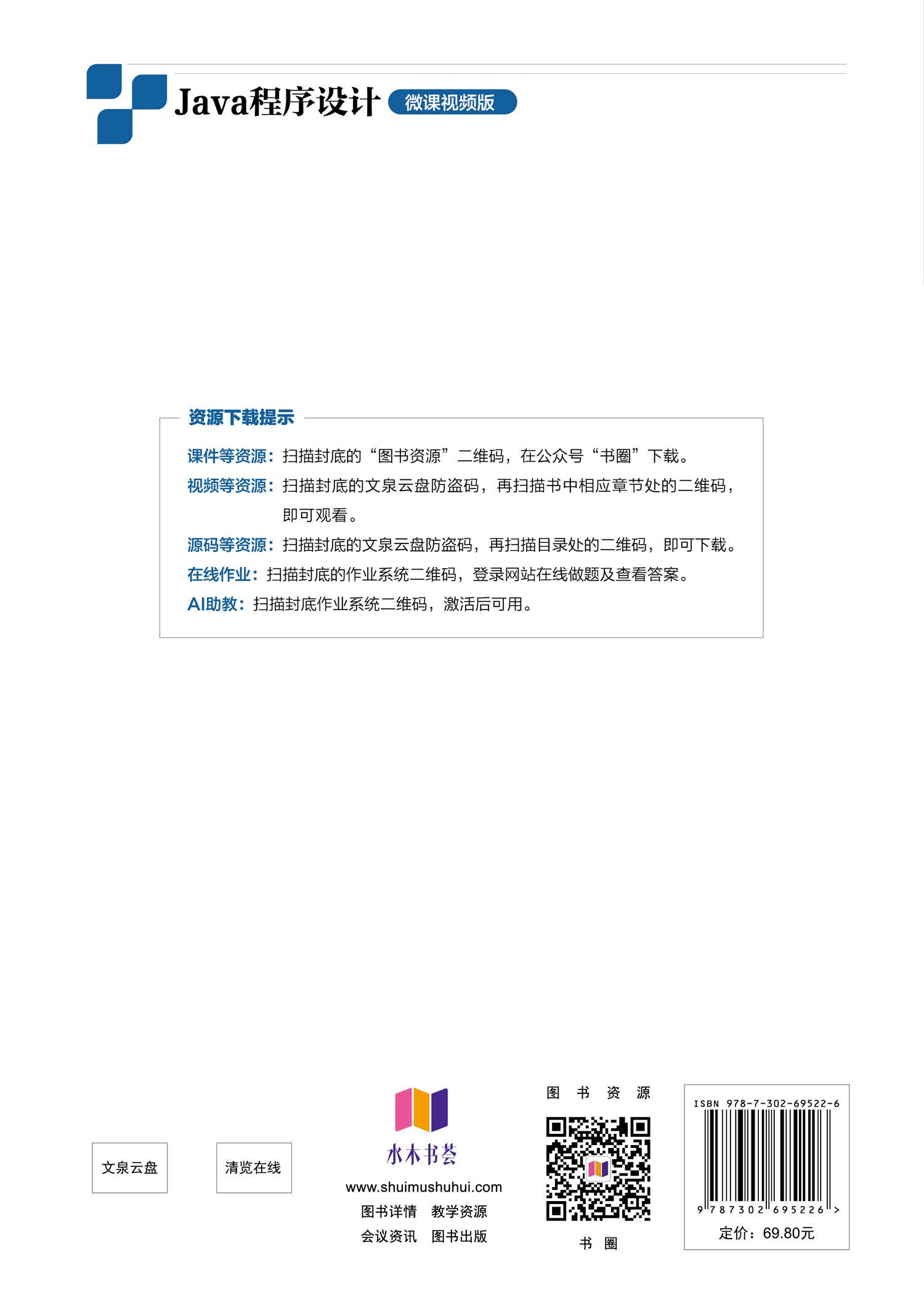 "本书全面阐述Java语言编程技术,语言简洁、通俗易懂、内容全面、重点突出,并佐以大量例题以阐明重点内容。全书共16章,第1章介绍Java语言的核心特征,Java编程平台的搭建; 第2章和第3章介绍Java编程基础知识,包括基本数据类型、流程控制; 第4~11章介绍面向对象编程的核心技术,包括类和对象、继承、抽象类、接口和多态、JDK常用类、输入/输出流、泛型编程和集合类等内容; 第12章介绍Java数据库编程技术; 第13章介绍Java图形用户界面编程技术; 第14章介绍多线程编程技术; 第15章介绍套接字; 第16章介绍Java反射技术。限于篇幅,第16章以二维码拓展阅读的形式展示。 本书可以作为高等学校计算机科学和软件工程等相关专业“Java程序设计”课程的教材,也可以作为开发Java程序的参考书。 "