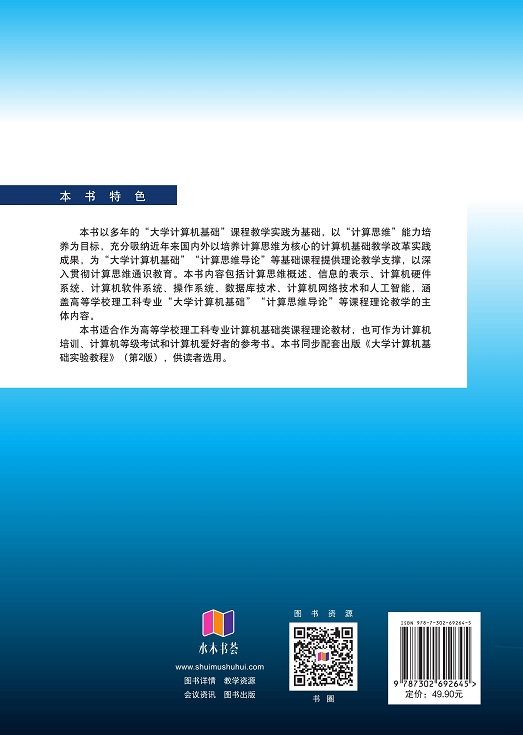 前言 大学计算机基础——计算思维与信息素养(第2版)随着信息化技术的普及,办公自动化、计算机网络、计算机应用已成为绝大多数人工作、生活的基本工具,计算机科学技术成为人们必须学习的基本技能。“大学计算机基础”“计算思维导论”等相关课程是大学本科教育的第一门计算机公共基础课程,在培养学生计算机知识、素质、应用能力方面具有非常重要的基础性和先导性作用。 1. 教材的定位 从社会和科技发展进步的变化中可以看出,大学计算机课程应该讲授计算思维,由知识/操作型课程转型为思维/能力培养型课程。因此,区别于以往对计算知识、计算机概念和操作的课程认识,作为科学文化基础课,课程的教学目标应重新定位为“使学生获得理解计算机发展、软硬件系统、算法、信息安全等方面的基本知识,掌握信息处理的基本方法和多媒体运用的基本技术,初步具备运用计算工具解决实际问题的能力,培养学生的信息素养和计算思维”,既不是单纯的理论知识,也不是简单的实验指导,而是一门思维方法的训练课程。 2. 教材的主要内容 为了更好地开展课程理论教学工作,作者根据多年的教学积累,以计算思维能力培养为目标,修改完善了计算机知识与计算思维有机融合的理论教程。 第1章,计算思维概述。本章介绍信息、数据、计算和计算机发展历史,突出信息素养的重要性,旨在让学生了解信息技术中的计算与传统数学计算的区别,以及计算机作为重要的信息化工具其发展历程和核心思想,从而体会计算思维的基本概念及其在计算机科学中的体现。本章重点是计算的概念、图灵机、计算机发展历史和计算思维。 第2章,信息的表示。本章介绍信息在计算机中的表示与存储,包括常见的数值型...