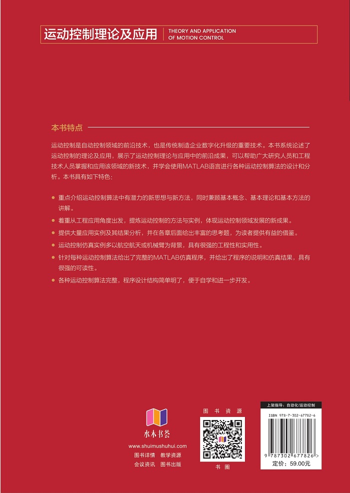 (1)重点介绍运动控制算法在学科交叉部分的前沿研究,并介绍运动控制算法中有潜力的新思想与新方法,同时兼顾基本概念、基本理论和基本方法的讲解。