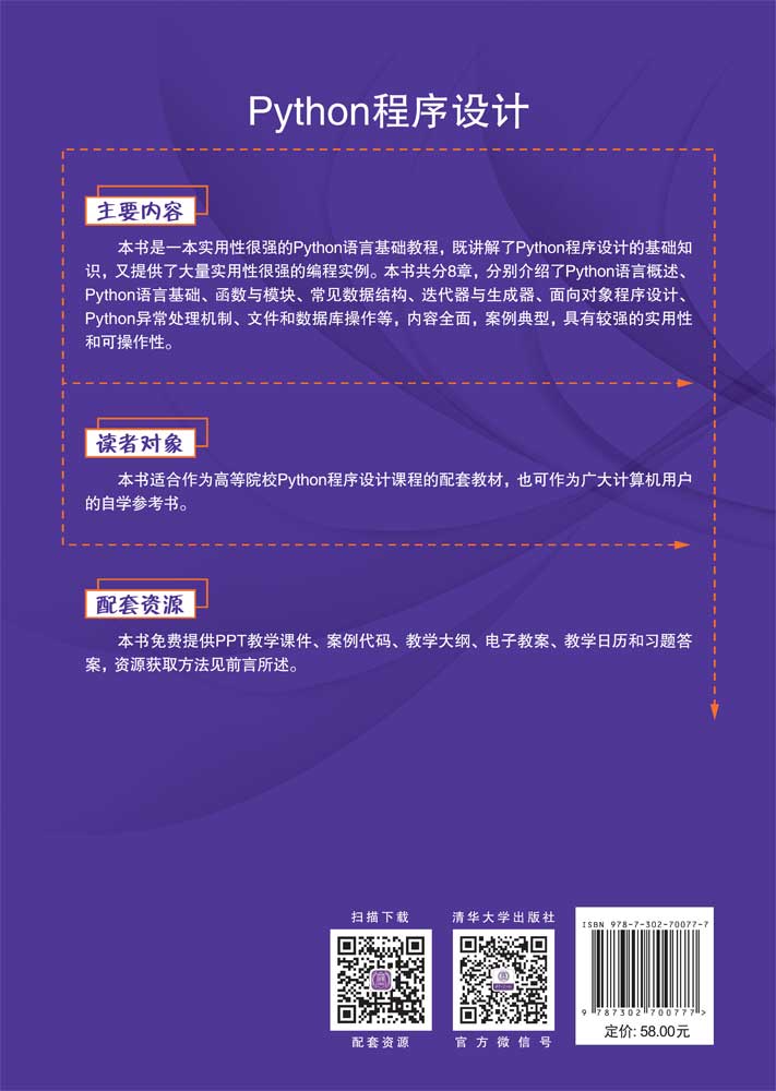 "《Python程序设计》是一本实用性很强的Python语言基础教程,既讲解了Python程序设计的基础知识,又提供了大量实用性很强的编程实例。本书共分8章,分别介绍了Python语言概述、Python语言基础、函数与模块、常见数据结构、迭代器与生成器、面向对象程序设计、Python异常处理机制、文件和数据库操作等。 本书内容丰富、结构清晰、案例典型,具有很强的实用性和可操作性,适合作为高等院校Python程序设计课程的配套教材,也可作为广大计算机用户的自学参考书。"