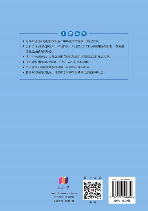 本书主要内容包括Windowsl1操作系统实验、WPS文字软件实验、WPS表格软件实验、WPS演示软件实验、计算机网络实验、WPS绘制流程图实验、Python 编程入门、常用工具软件的使用、MATLAB应用实验。重要实验配有相应的视频讲解操作,通过扫描二维码即可获得实验的对应视频。书后提供了一套测试题,供学生进行自我测试以巩固所学知识。"