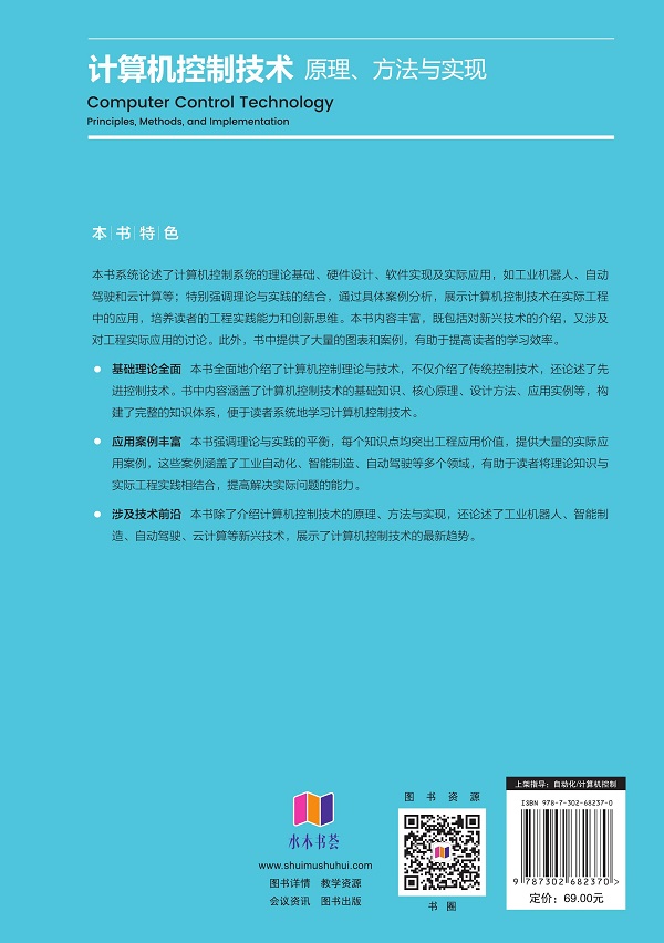 "本书系统论述了计算机控制系统的理论基础、硬件设计、软件实现及实际应用,如工业机器人、自动驾驶和云计算等。特别强调理论与实践的结合,通过具体案例分析,展示计算机控制技术在实际工程中的应用,培养读者的工程实践能力和创新思维。书中内容丰富,既包括对新兴技术的介绍,又涉及工程实际应用的讨论。此外,书中提供了大量的图表、示例和习题,有助于提高读者的学习效率。全书具有如下特点: