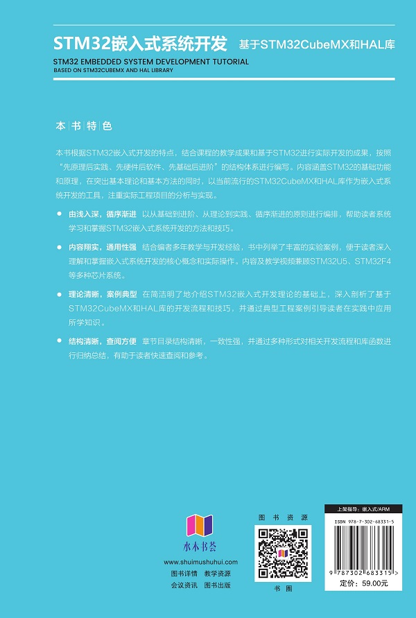 内容翔实,通用性强 结合编者多年教学与开发经验,书中列举了丰富的实验案例,便于读者深入理解和掌握嵌入式系统开发的核心概念和实际操作。内容及教学视频兼顾STM32U5、STM32F4等多种芯片系统。