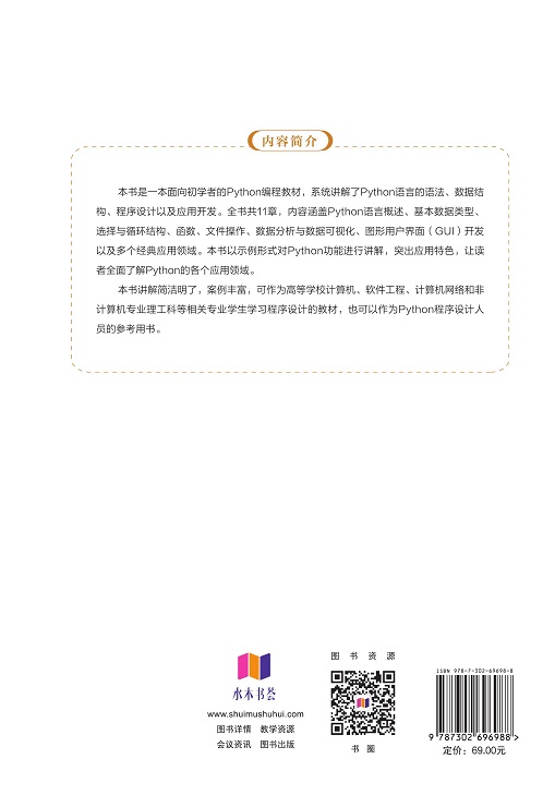 "本书是一本面向初学者的Python编程教材,系统讲解了Python语言的语法、数据结构、程序设计以及应用开发。全书共11章,内容涵盖Python语言概述、基本数据类型与运算、组合数据类型、选择与循环语句结构、函数、文件操作、词云与PyInstaller库应用、数据分析与数据可视化、图形用户界面(GUI)开发以及多个经典应用领域。本书以示例形式对Python功能进行讲解,突出应用特色,让读者全面了解Python的各个应用领域。 本书讲解简洁明了,案例丰富,可作为高等学校计算机、软件工程、计算机网络和非计算机专业理工科等相关专业学生学习程序设计的教材,也可作为Python程序设计人员的参考用书。 "