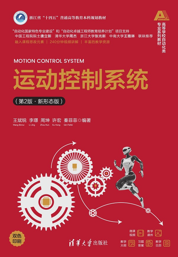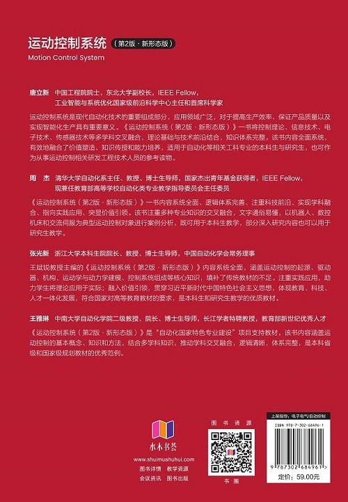 "《运动控制系统(第2版·新形态版)》共8章,系统介绍了运动起源——驱动器,实现基础——机构,分析基础——运动学和动力学建模,控制系统的组成——运动感知、控制算法、控制器硬件和软件等方面的知识,主要内容有典型的仿生运动机构,坐标系变换、运动学、动力学建模,常用运动测量传感器及定位、避障,常规和智能驱动器,电动机电磁原理、伺服电动机模型及控制策略,运动控制系统建模,常用运动控制算法,运动控制器硬件和软件及操作系统、现场总线技术。 《运动控制系统(第2版·新形态版)》可作为自动化、电气工程及其自动化、电子信息工程、测控技术和机械设计制造及其自动化等工科专业的本科生及研究生教材,也适合作为从事运动控制相关工作的工程技术人员的参考读物。"