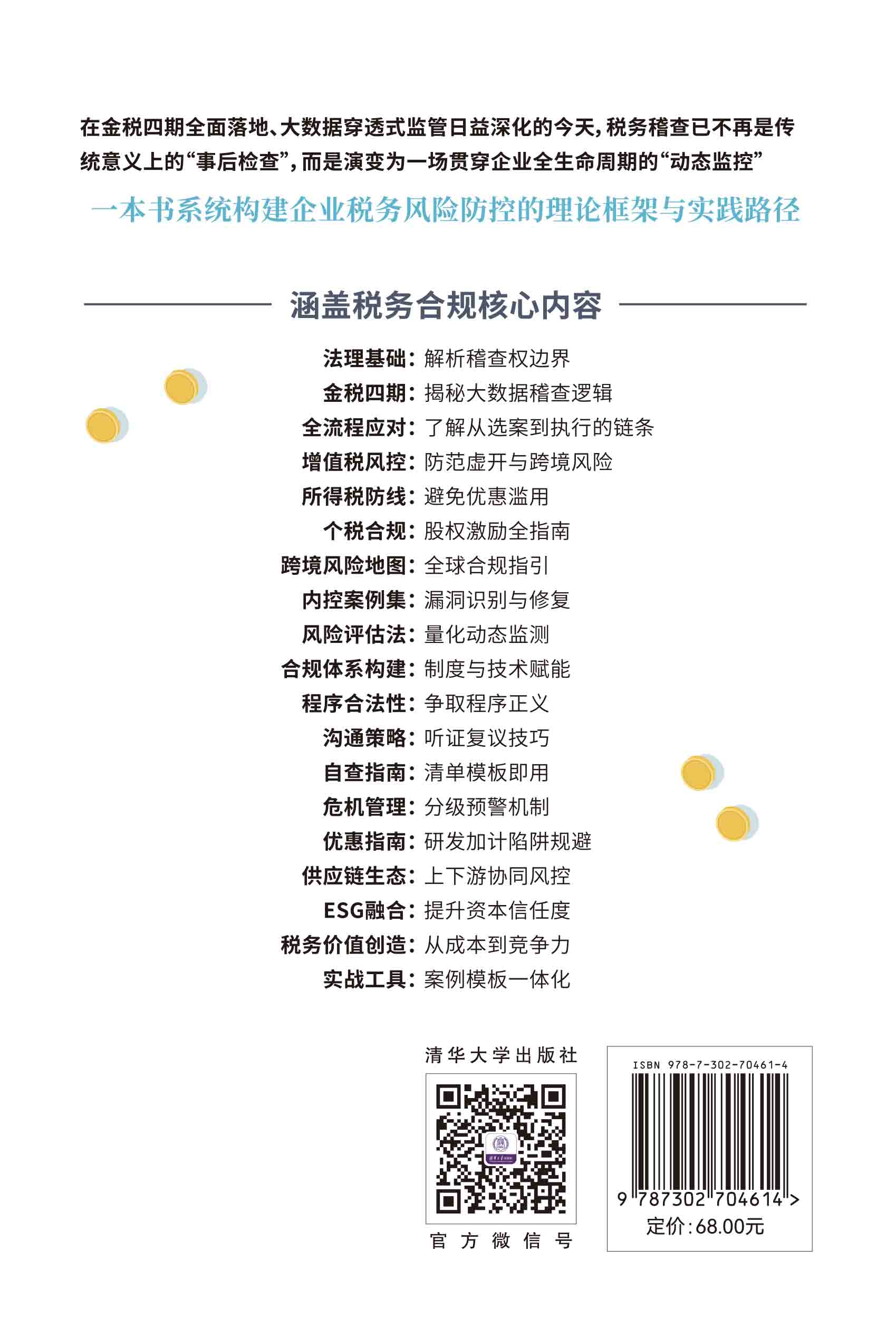 系统全面:全流程拆解税务稽查环节,内容覆盖从税务稽查的法理基础、全流程应对,到增值税、企业所得税等核心税种的风险防范,再到跨境税务、危机管理等具体场景