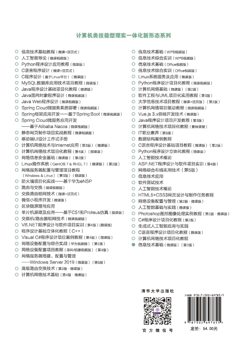 "本书是根据《高等职业教育专科信息技术课程标准(2021年版)》编写,是一本校企联合开发的适合职业院校学生学习掌握信息技术基础应用的教材,同时能够为学习者提供综合性学习支持。本书从计算机基础结构、安全、配置优化等内容讲起,包括图文处理技术、电子表格技术、演示文稿制作、信息检索技术、新一代信息技术简介(包括物联网、云计算、区块链、人工智能等知识),同时还介绍了使用信息技术过程中应具备的职业素养。本书采用“项目引领、任务驱动”的组织模式,全书分为7个项目,采用“任务知识点→任务描述→知识与技能→任务实现→任务小结→职场赋能→习题小测”的编写模式,将工作场景中常用信息技术进行有机整合,使知识生动有趣且具有较高的实用性,既能满足信息素养教育提升,又能作为专升本、等级考试的教学参考。 本书不仅可供职业教育阶段学生使用,也可供对信息技术有兴趣的读者参考学习。"