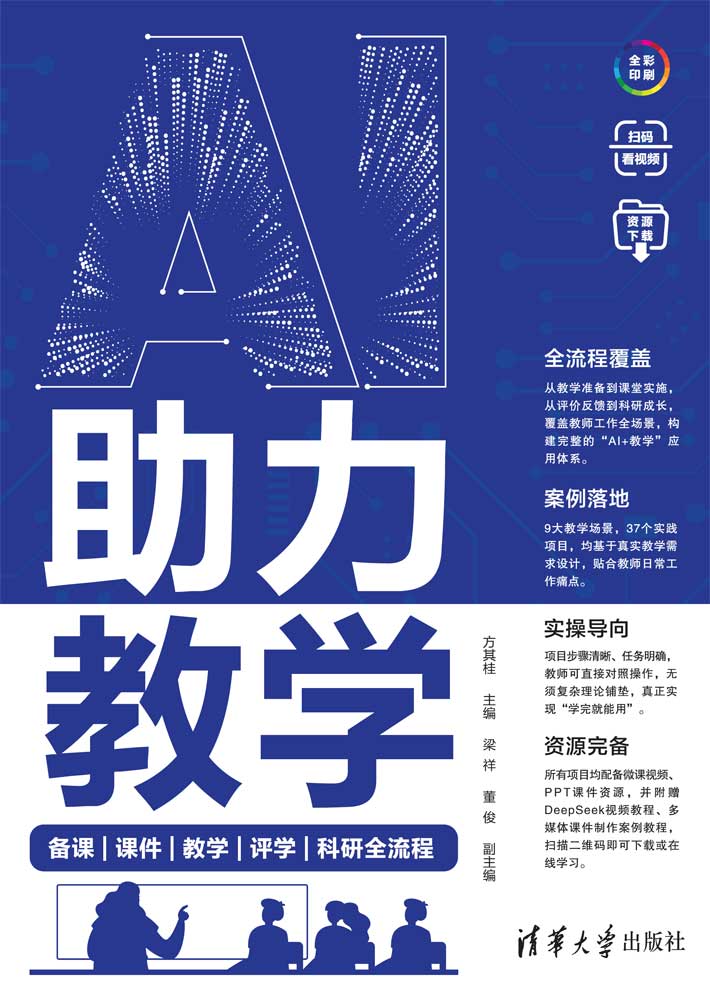 前言 这不是一本用AI(artificial intelligence,人工智能)攒出来的书,而是我们凌晨4点仍在深入研究、反复实践的结晶,它既是写给一线教师的AI教学应用指南,也是帮助教育工作者拥抱智能时代的实践手册。 这不是一本空谈理论的学术著作,编者希望它能成为教师们将AI技术融入日常教学全流程的得力工具,让每一位教师都能在智能浪潮中从容前行,提升教学效能。而如何跨越“技术鸿沟”,让AI从遥不可及的“技术名词”,变成教学中实实在在的“得力助手”,这正是我们编写《AI助力教学:备课课件教学评学科研全流程》的初衷。 1.人工智能的概念 简单来说,人工智能就是能像人一样“思考”和“干活”的计算机程序。当我们让它写一段教案时,它能很快完成;让它做一个课件插图时,它能画出几种风格供我们选择;问它怎么分析学生错题时,它也能给出具体建议。现在常说的生成式人工智能,就像一个“万能助手”——你说要什么,它就能生成你需要的东西;而大语言模型更像一个“会聊天的专家”,我们只需说清楚教学需求,它就能理解我们的意思,并能帮我们理顺、细化想法,给出合适的方案。 但说到底,AI只是一个工具,正如键盘只能用来打字,文章写得好不好,关键在于思想;教学效果好不好,也取决于教师的教学理念、教学方法,以及能否灵活使用AI工具。 2.人工智能在教学中的作用 在教育数字化转型的当下,人工智能已从“未来概念”转变为“当下必需”。无论是课堂前的备课设计与课件制作,教学中的互动实施与课堂管理,课后的评学分析与教学改进,还是教师个人的科研工作,都面临着效率提升与质量优化的双重需求。而人工智能的助力,正是...