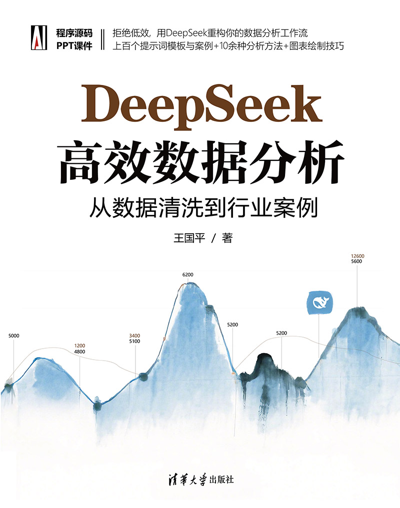 内容简介:"《DeepSeek高效数据分析:从数据清洗到行业案例》以DeepSeek大模型为核心工具,系统讲解其在数据分析与可视化中的创新应用。《DeepSeek高效数据分析:从数据清洗到行业案例》共12章。第1章简要介绍DeepSeek的技术架构、本地部署与在线开发环境,为后续分析奠定技术基础。第2~4章聚焦多源数据获取、数据清洗及预处理,提供标准化操作流程与代码实例。第5~8章介绍描述性统计、频数分析、相关性分析、线性/曲线/逻辑回归、K-Means聚类、时间序列分析等核心算法,结合GDP分析、商品评论挖掘等案例解析其应用逻辑。第9、10章通过混淆矩阵、ROC曲线、交叉验证等工具评估模型效果,剖析欠拟合/过拟合现象,并讲述如何生成结构化分析报告。第11、12章以金融量化和电商平台为场景,串联Jieba分词、词云生成、雷达图等工具,还原真实业务问题的解决路径。