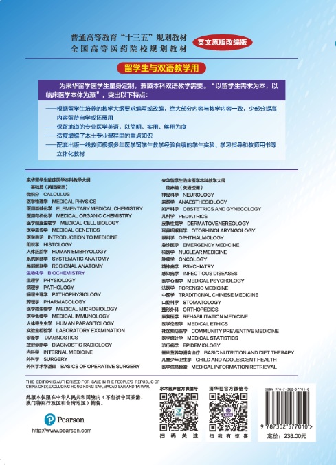 Preface 前言 新时代的中国软实力与日俱增,来华学医成为众多留学生的首选。高质量的临床医学专业的全英文教材对于提升留学生的培养质量至关重要。在临床医学专业留学生教材建设专家指导委员会和清华大学出版社的支持下,我们完成了这本《生物化学》教材的改编工作。本教材在充分尊重原著的基础上,保留其基本框架,参考清华大学出版社出版的《来华留学生临床医学专业本科(英语授课)教学大纲》和国家执业医师资格考试大纲进行改编,内容涵盖大分子结构与功能、物质代谢与调节,以及遗传信息传递等。本书编排上力求简明扼要,重点突出,可作为来华留学临床医学学士(MBBS)和我国长学制临床医学专业学生使用的教材,也可作为相关学科的硕士研究生、进修生和教师的参考书。 在各医学院校推荐的基础上,本教材改编委员会遴选出天津医科大学杨洁教授担任主审,25所医学院校的编委共同完成了本教材的改编工作。由于改编者的知识局限,本教材难免存在缺点和错误,敬请同行专家、使用本教材的师生和其他读者批评指正。 吕立夏 王秀宏 刘 欣 2021年3月