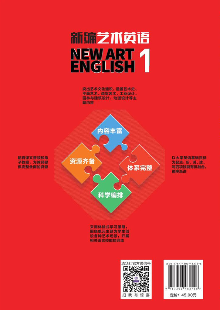 ? 本教材为湖北大学“大学英语拓展系列课程”之一,以大学英语基础目标为起点,听、说、读、写四项技能有机融合,循序渐进 ? 突出艺术文化通识,涵盖艺术史、平面艺术、造型艺术、工业设计、园林与建筑设计、动漫设计等主题内容 ? 采用体验式学习策略,围绕单元主题为学生创设各种艺术场景,开展相关语言技能的训练 ? 资源齐备,配有课文音频和电子教案,为教师提供完整全面的资源。教师可登录ftp://...下载