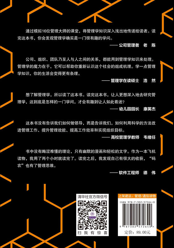 这本书的重点不在于教授读者那些深奥的理论,或者让读者学习繁杂的知识来分析管理学现象和问题,而在于逐步引导读者,让读者能像管理学家那样思考,用管理学家的思维去思考问题,用管理学内容去解决问题。就让我们与16位国际管理学大师一起,展开一场奇妙的管理学之旅吧!