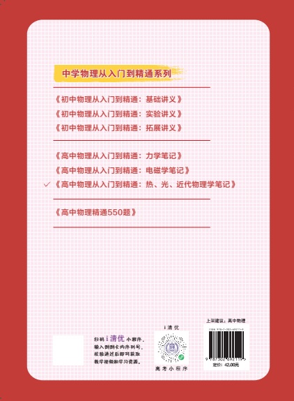 前.言 在高中物理学习的过程中,很多时候同学们会有这些疑惑和困难:课前,光看课本往往不知道重点是什么;课上,过度注重抄笔记导致分散注意力,无法专注于思考和理解所学内容;课后,迷失在“题海”中而忽略了物理的本质。其实,学好物理,关键在于对知识的提炼、理解和内化,而这并非易事。因此,一本由老师精心整理的笔记将会是同学们预习、学习和复习时的重要抓手。 全套笔记分为三本:力学笔记,电磁学笔记,热、光、近代物理学笔记,新教材、新高考适用。每本包含两部分内容,一部分是与课程板书一致的手写笔记,基于教材脉络设置章节顺序,整合知识点,详细总结归纳了基本原理、公式及其推导过程、物理模型、例题与解析、解题思路与方法、易错点等,为同学们提供了简明的学习路径,使同学们在学习的过程中能够更好地把握高中物理的核心思想;另一部分是包含一系列代表性题目的习题册,精选了适量与笔记知识点对应的练习题。题目难度适中,面向高考,旨在帮助同学们通过练习巩固所学知识,加深理解。每一道习题都配备了详细的答案解析,方便同学们自我检验和查漏补缺。 这套笔记是由我在清华附中多年教学的手写教案提炼而成。在出版这套笔记的过程中,我力求保持原汁原味的手写风格,让同学们能够感受到我的教学思路和课堂氛围。同时,我也对笔记进行了精心的加工和整理,以便让同学们更加清晰地理解和记忆其中的内容。我相信,这套手写笔记将成为大家学习物理的重要伙伴,陪伴大家走向更深远的物理世界。 这套笔记的一大特色在于配备了完整的免费视频课程,全网播放量超过千万次。从2018年开始,我陆续在网上发布教学类课程。一开始只是作为日常教学的记录,随着课程内容越来越完...