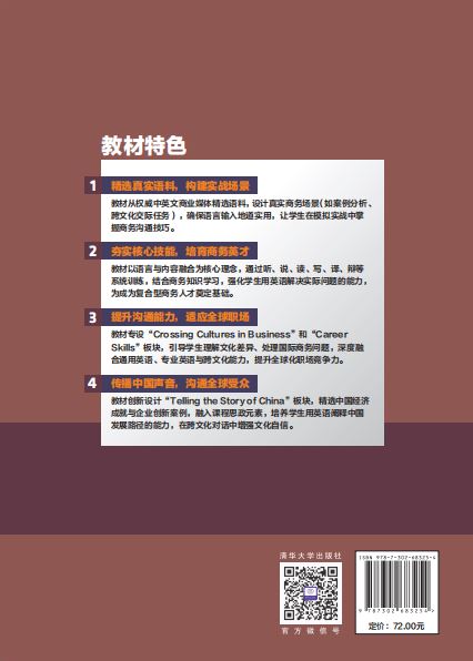 "本教材按照从易到难,从点到面的原则,从消费者-管理者-经营者-决策者-研究者等角度选取学习主题材料,将语言能力的提升与商务知识的积累、扩展有机结合,逐级增加学习难度。教材将鲜活生动、原汁原味的阅读材料、丰富多样的练习形式、典型多维的商务文化、贴合主题且形式多样的商务案例,以及对比回顾、阐释我国在改革开放40多年来取得的瞩目成就有机融合,在培养提升学生的英语运用能力的同时,扩展学生的商务知识,培养学生的跨文化沟通意识和能力,锻炼提高学生的思辨能力,引导学生关注理解中国在商务活动中取得的伟大成就,落实立德树人的根本任务。 特色: 1. 可读性 融合原汁原味的的商务英语篇章。 2. 实用性 全面夯实语言技能,以消费者、学习者、管理者、研究者、创新者、政策提议者等不同身份对全球化背景下的国内外商务活动进行观察、思考、研讨、模拟、创新。 3. 交叉性 注重语言知识与商务知识、跨文化知识的融会贯通。 4. 思想性 有机融合课程思政元素,提升读者的国家认同感、自信心和自豪感。。 5. 进阶性 不同分册涵盖多梯度、多维度的商务知识,尊重学习规律。 读者对象:本科阶段一、二年级大学英语通用教材、商务英语专业基础阶段教材以及企业员工和社会各界人士学习或者培训商务英语的材料。 "