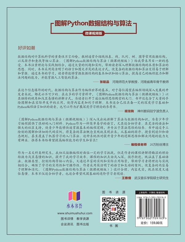 本书注重理论与实践相结合,通过大量的例题和实例,帮助读者深入理解数据结构的本质和算法的思想。本书语言简洁明了、图文并茂,通过本书的学习,读者将能够掌握数据结构的基本知识和核心算法,提高自己的编程能力和解决问题的能力,并能掌握人工智能的算法。