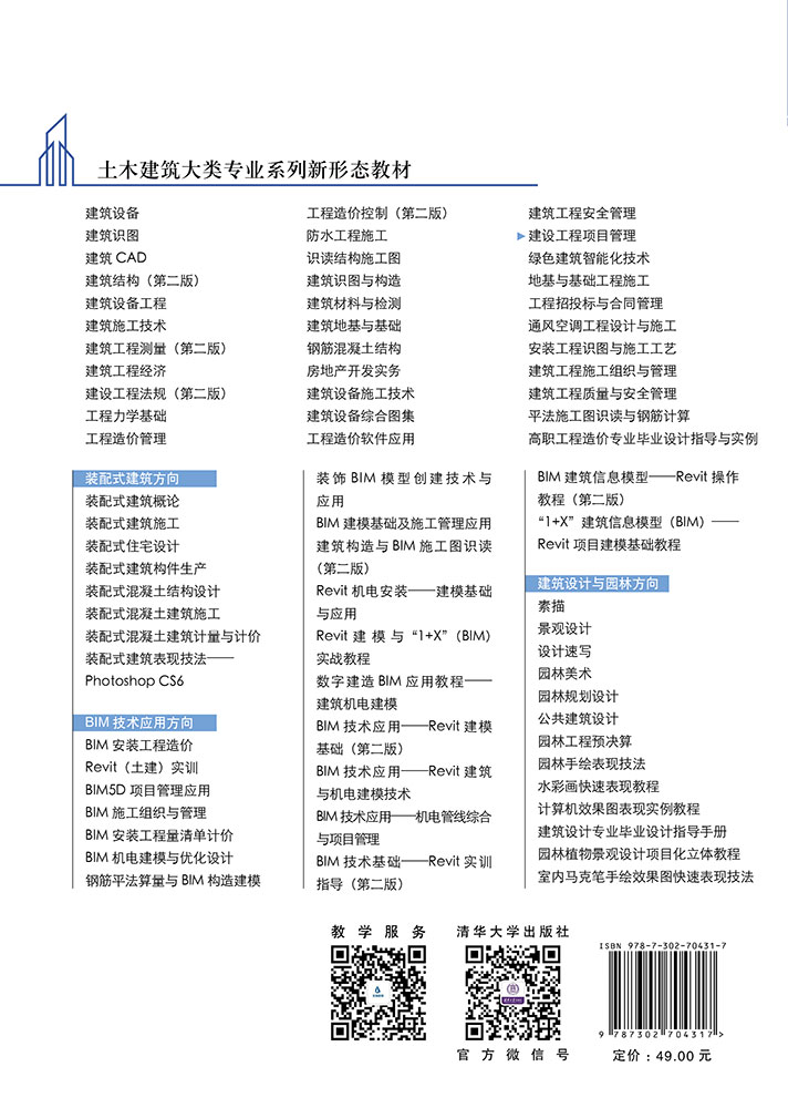 本书具有较强的实用性与通用性,不仅可作为高等院校工程管理等土建类专业职业本科生的工程项目管理课程教材,也可作为各类成人教育学校相关课程教材,还可作为施工一线工程技术及项目管理人员参考用书。"