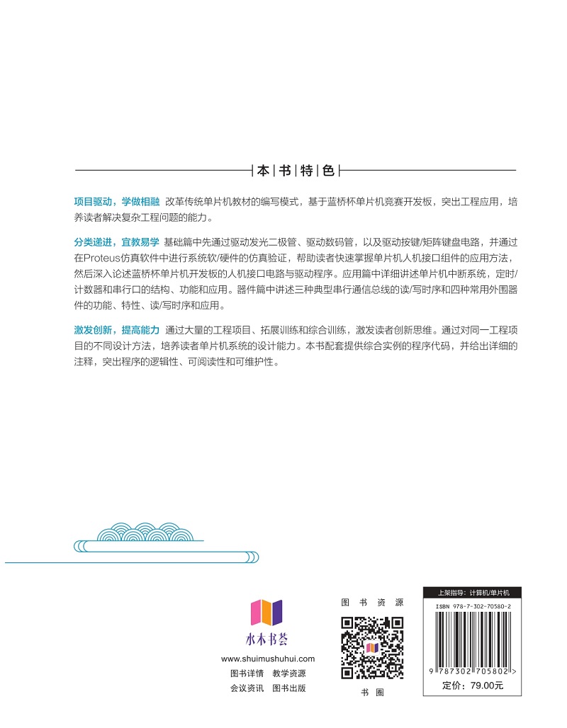 前言 微处理器是通信、信号处理以及大数据和人工智能等电子信息产业的基石。党的二十大报告中有“教育、科技、人才是全面建设社会主义现代化国家的基础性、战略性支撑”和“必须坚持科技是第一生产力、人才是第一资源、创新是第一动力”等著名论述,强调了人才培养和科技创新的重要性。 为加快高等院校计算机和电子信息专业教学创新与改革,提高学生自主创新意识和工程实践能力,工业和信息化部人才交流中心主办的“蓝桥杯全国软件和信息技术专业人才大赛”至今已举办了15届,包括清华大学、北京大学、复旦大学在内的全国1900多所院校的学生报名参加了竞赛,参赛学生总数突破120万人,已成为具有重大社会影响力和行业认可度的信息技术(Information Technology,IT)类学科竞赛。 为什么要写这本书 MCS51系列单片机已有40多年的发展和应用历史,市面上有关单片机的图书琳琅满目: 有以停产多年的经典AT89系列单片机为核心讲述的,有以目前广泛应用的国产STC系列单片机为核心讲述的,有基于Proteus仿真软件为特色的,也有以详细介绍单片机资源及应用为特点的。但总体来说,讲述单片机资源及应用的图书多,突出应用能力培养的教材却比较少,以提升单片机综合系统设计能力为特色的教材更少。 本书以指导学生参加蓝桥杯单片机设计与开发竞赛为契机,以竞赛的要求为导向,采用模块化组织方式,由浅入深、分类递进地讲述单片机人机接口的驱动方法、单片机内部资源的结构和应用以及常用外部器件的功能与应用要点。同时,在基础篇中补充了数制与编码、数字逻辑和门电路,以及部分组合逻辑器件和时序...
