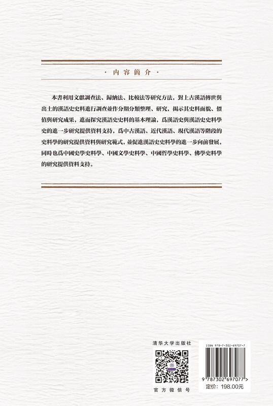 本书利用文献调查法、归纳法、比较法等研究方法,对上古汉语传世与出土的汉语史史料进行调查并作分期分类整理、研究,揭示其史料面貌、价值与研究成果,进而探究汉语史史料的基本理论,为汉语史与汉语史料学史的进一步研究提供数据支持,为中古汉语、近代汉语、现代汉语等阶段的史料学的研究提供资料与研究范式,并促进汉语史史料学的进一步向前发展,同时也为中国史学史料学、中国文学史料学、中国哲学史料学、佛学史料学的研究提供数据支持。