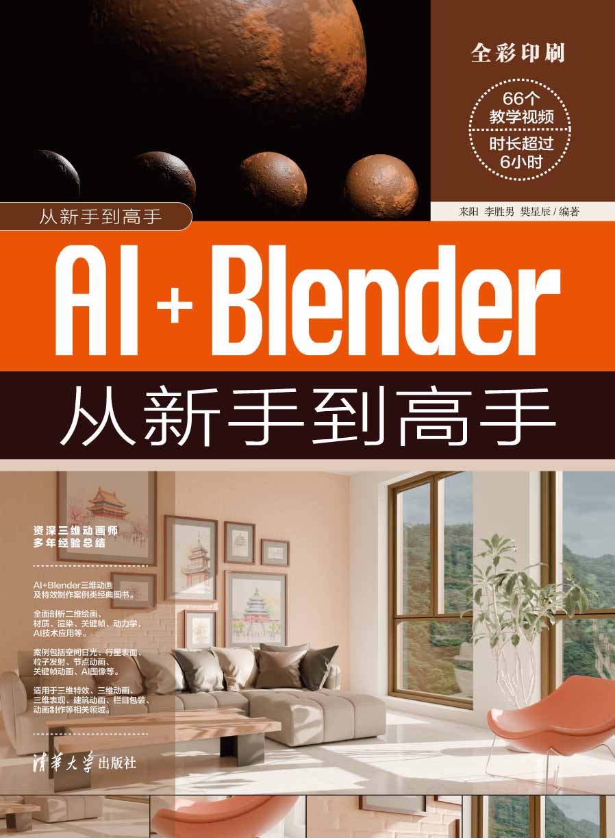 "Blender软件旨在为广大三维动画师提供了功能丰富、强大的动画工具来制作优秀的动画作品。本书主讲如何使用中文版blender软件来进行三维动画制作的技术书籍。全书共分为9章,包含了界面组成、模型制作、灯光技术、摄影机技术、材质贴图、渲染技术、粒子系统、AI插件等一系列三维动画制作技术。本书结构清晰、内容全面、通俗易懂,各个章节均设计了相对应的实用案例,并详细阐述了制作原理及操作步骤,注重提升读者的软件实际操作能力。另外,本书附带的教学资源内容丰富,包括本书所有案例的工程文件、贴图文件和多媒体教学录像,便于读者学以致用。 "