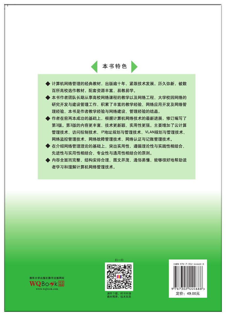 本书作者团队长期从事高校网络课程的教学以及网络工程、大学校园网络的研究开发与建设管理工作,积累了丰富的教学经验、网络应用开发及网络管理经验,本书是作者教学经验与网络建设、管理经验的结晶。本书经十多年的发展,历久弥新,被数百所高校选作教材,已经成为计算机网络管理的经典教材。作者在前两本成功的基础上,根据计算机网络技术的最新进展,修订编写了第3版。第3版的内容更丰富、技术更新颖、实用性更强。主要增加了云计算管理技术、访问控制技术、IP地址规划与管理技术、VLAN规划与管理技术、网络监控管理技术、网络故障管理技术、网络认证与记账管理技术。内容全面而完整、结构安排合理、图文并茂、通俗易懂,能够很好地帮助读者学习和理解计算机网络管理技术。在介绍网络管理理论的基础上,突出实用性,遵循理论性与实践性相结合、先进性与实用性相结合、专业性与通用性相结合的原则。
