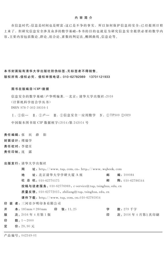 在信息时代,信息是时间也是财富,这已是不争的事实。所以如何保护信息的安全,已经提到日程上来了。但研究信息安全涉及众多的数学基础,本书的目的也就是为研究信息安全提供必要的数学内容,主要内容包括数论、群论、组合论、素数的判定法、椭圆曲线、信息论等。