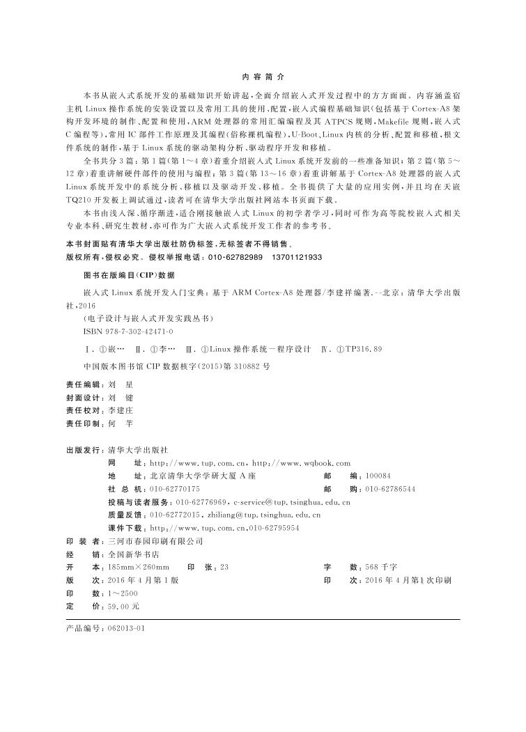 本书从嵌入式系统开发的基础知识开始讲起,全面介绍嵌入式开发过程中的方方面面。内容涵盖宿主机Linux操作系统的安装设置以及常用工具的使用、配置,嵌入式编程基础知识(包括基于CortexA8架构开发环境的制作、配置和使用,ARM处理器的常用汇编编程及其ATPCS规则,Makefile规则,嵌入式C编程等),常用IC部件工作原理及其编程(俗称裸机编程),UBoot、Linux内核的分析、配置和移植,根文件系统的制作,基于Linux系统的驱动架构分析、驱动程序开发和移植。 全书共分3篇: 第1篇(第1~4章)着重介绍嵌入式Linux系统开发前的一些准备知识; 第2篇(第5~12章)着重讲解硬件部件的使用与编程; 第3篇(第13~16章)着重讲解基于CortexA8处理器的嵌入式Linux系统开发中的系统分析、移植以及驱动开发、移植。全书提供了大量的应用实例,并且均在天嵌TQ210开发板上调试通过,读者可在清华大学出版社网站本书页面下载。 本书由浅入深、循序渐进,适合刚接触嵌入式Linux的初学者学习,同时可作为高等院校嵌入式相关专业本科、研究生教材,亦可作为广大嵌入式系统开发工作者的参考书。