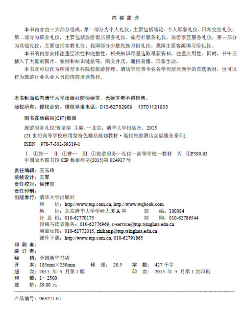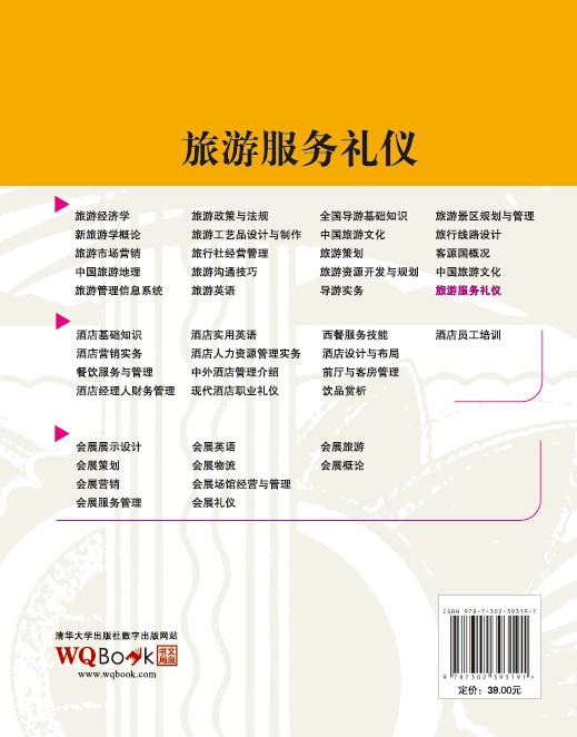 前 言 旅游服务礼仪是旅游从业人员必须遵循的行为规范和职业理念,它既能衡量旅游从业者的素质、道德、教养的高低,也能反映一个国家旅游业整体的精神文明素养的高低。当前,面对国际旅游业的快速发展和激烈的市场竞争,加强旅游服务礼仪规范,加速旅游服务专业人才培养已成为亟待解决的问题。为满足日益增长的旅游市场需求,培养社会急需的旅游服务技能人才,我们组织多年从事旅游服务礼仪教学和实践活动的一线教师,共同精心编撰了本书,旨在更好地服务于我国的旅游事业。 本书通过个人礼仪、职业礼仪及其他礼仪三个大的方面来详细介绍旅游服务礼仪,具体内容可分为九章,即:绪论、个人形象礼仪、日常交往礼仪、旅游饭店服务礼仪、旅行社服务礼仪、旅游景区服务礼仪、宗教礼仪、我国部分少数民族习俗礼仪、我国主要客源国习俗礼仪。由于本书融入了旅游服务礼仪最新的实践教学理念,力求严谨,注重与时俱进,结构新颖、内容翔实、流程清晰、案例生动、贴近实际、突出实用性,注重旅游服务的工作过程和岗位技能要求,注重实践能力培养,因此本书既可以作为职业院校旅游管理、酒店管理等专业各学历层次教学的首选教材,也可以作为旅游行业从业人员的岗前培训教材。 本书由曹培培担任主编,负责全书的策划、统稿、审定工作,孙丰念、闫莹娜担任副主编。具体编写人员及分工如下:曹培培(第一章、第七章、前言及附录),孙丰念(第二章、第三章)、齐琳(第四章),张德平(第五章、第六章)、闫莹娜(第八章、第九章)。 为方便广大教师教学和学生学习,本书还配套提供了电子课件及习题答案,读者可以从清华大学出版社网站(www.tup.com.cn)免费下载使用...