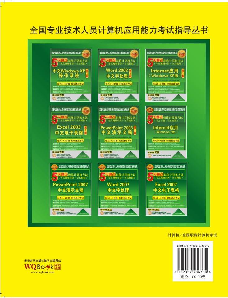 前 言 “全国专业技术人员计算机应用能力考试”又称为“全国职称计算机考试”,是国家人力资源和社会保障部在全国范围内推行的一项全国性考试,并将考试成绩作为评聘专业技术职务的条件之一。 本丛书为没有太多时间和精力来准备考试、需要考前突击的考生而编写,使考生在5天内通过强化训练顺利通过考试。 本丛书目前已推出12种图书,具体如下。 《5天通过职称计算机考试(考点视频串讲+全真模拟)——中文Windows 7操作系统》 《5天通过职称计算机考试(考点视频串讲+全真模拟)——中文Windows XP操作系统》(第2版) 《5天通过职称计算机考试(考点视频串讲+全真模拟)——Word 2007中文字处理》 《5天通过职称计算机考试(考点视频串讲+全真模拟)——Word 2003中文字处理》(第2版) 《5天通过职称计算机考试(考点视频串讲+全真模拟)——Excel 2007中文电子表格》 《5天通过职称计算机考试(考点视频串讲+全真模拟)——Excel 2003中文电子表格》(第2版) 《5天通过职称计算机考试(考点视频串讲+全真模拟)——PowerPoint 2007中文演示文稿》 《5天通过职称计算机考试(考点视频串讲+全真模拟)——PowerPoint 2003中文演示文稿》(第2版) 《5天通过职称计算机考试(考点视频串讲+全真模拟)——Internet应用(Windows 7版)》 《5天通过职称计算机考试(考点视频串讲+全真模拟)——Internet应用(Windows XP版)》(第2版) ...