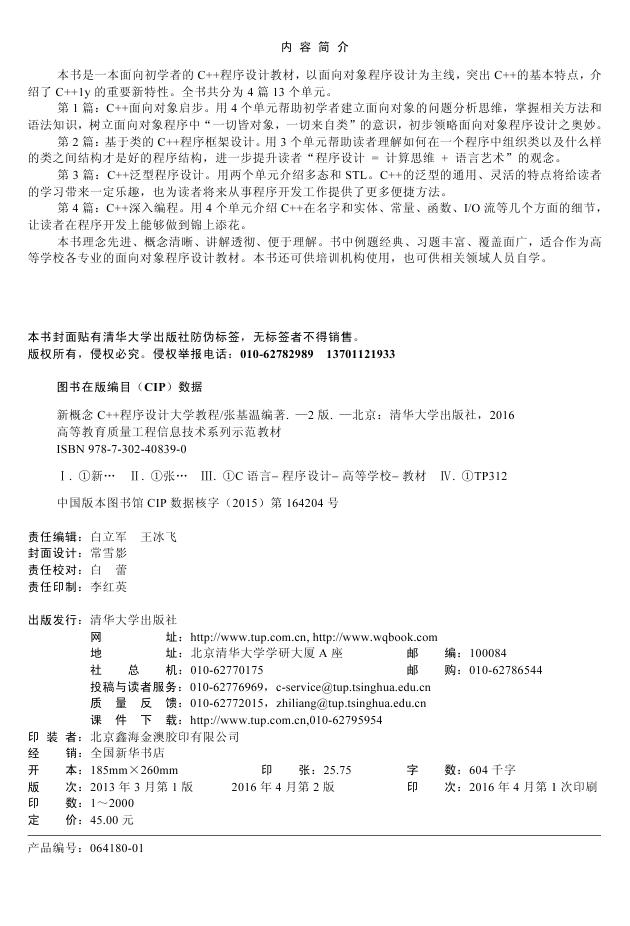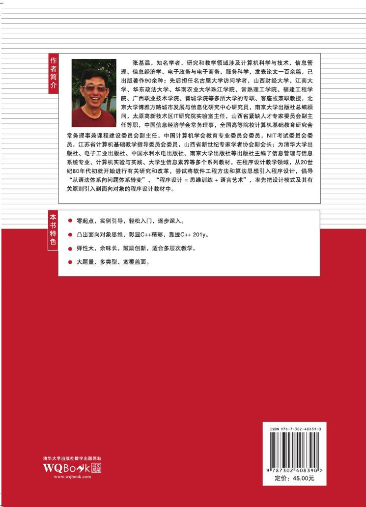 内 容 简 介 本书是一本面向初学者的C++程序设计教材,以面向对象程序设计为主线,突出C++的基本特点,介绍了C++1y的重要新特性。全书共分为4篇13个单元。 第1篇:C++面向对象启步。用4个单元帮助初学者建立面向对象的问题分析思维,掌握相关方法和语法知识,树立面向对象程序中“一切皆对象,一切来自类”的意识,初步领略面向对象程序设计之奥妙。 第2篇:基于类的C++程序框架设计。用3个单元帮助读者理解如何在一个程序中组织类以及什么样的类之间结构才是好的程序结构,进一步提升读者“程序设计 = 计算思维 + 语言艺术”的观念。 第3篇:C++泛型程序设计。用两个单元介绍多态和STL。C++的泛型的通用、灵活的特点将给读者的学习带来一定乐趣,也为读者将来从事程序开发工作提供了更多便捷方法。 第4篇:C++深入编程。用4个单元介绍C++在名字和实体、常量、函数、I/O流等几个方面的细节,让读者在程序开发上能够做到锦上添花。 本书理念先进、概念清晰、讲解透彻、便于理解。书中例题经典、习题丰富、覆盖面广,适合作为高等学校各专业的面向对象程序设计教材。本书还可供培训机构使用,也可供相关领域人员自学。