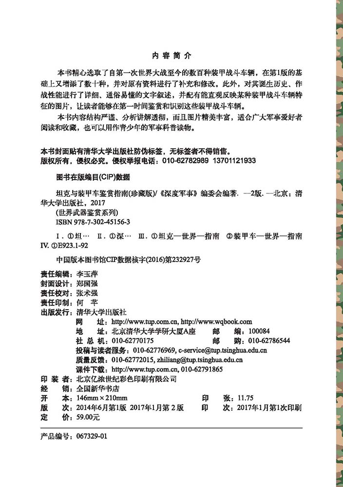 本书精心选取了自第一次世界大战至今的数百种装甲战斗车辆,在第1版的基 础上又增添了数十种,并对原有资料进行了补充和修改。此外,对其诞生历史、作 战性能进行了详细、通俗易懂的文字叙述,并配有能直观反映某种装甲战斗车辆特 征的图片,让读者能够在第一时间鉴赏和识别这些装甲战斗车辆。 本书内容结构严谨、分析讲解透彻,而且图片精美丰富,适合广大军事爱好者 阅读和收藏,也可以用作青少年的军事科普读物。