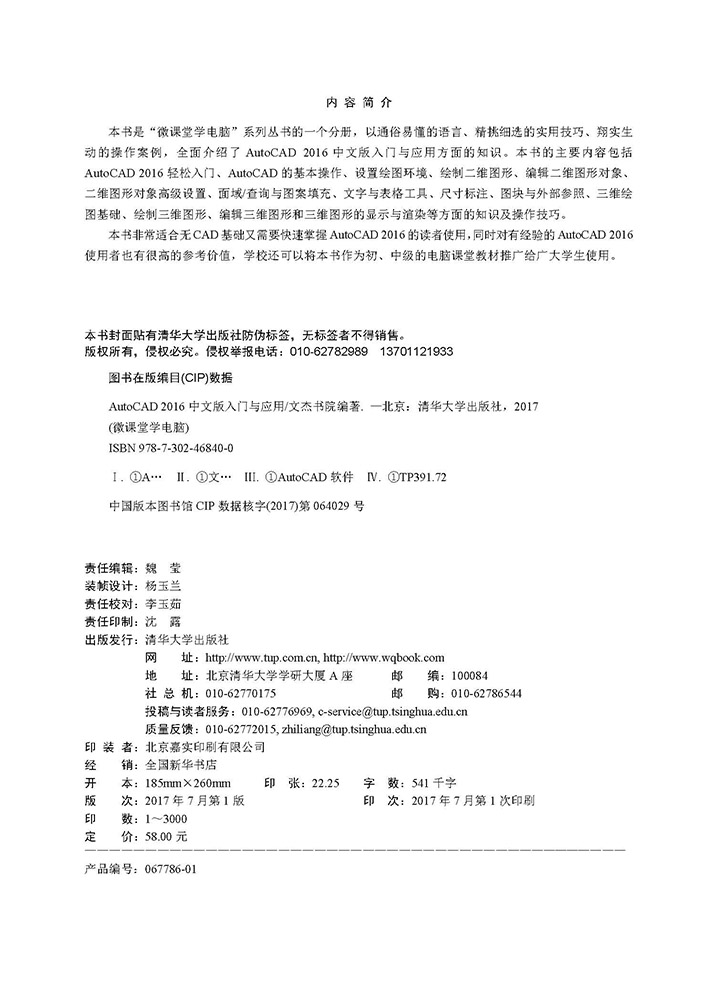 本书是“微课堂学电脑”系列丛书的一个分册,以通俗易懂的语言、精挑细选的实用技巧、翔实生动的操作案例,全面介绍了 AutoCAD 2016 中文版入门与应用方面的知识。本书的主要内容包括AutoCAD 2016轻松入门、AutoCAD的基本操作、设置绘图环境、绘制二维图形、编辑二维图形对象、二维图形对象高级设置、面域/查询与图案填充、文字与表格工具、尺寸标注、图块与外部参照、三维绘图基础、绘制三维图形、编辑三维图形和三维图形的显示与渲染等方面的知识及操作技巧。 本书非常适合无CAD基础又需要快速掌握AutoCAD 2016的读者使用,同时对有经验的AutoCAD 2016使用者也有很高的参考价值,学校还可以将本书作为初、中级的电脑课堂教材推广给广大学生使用。
