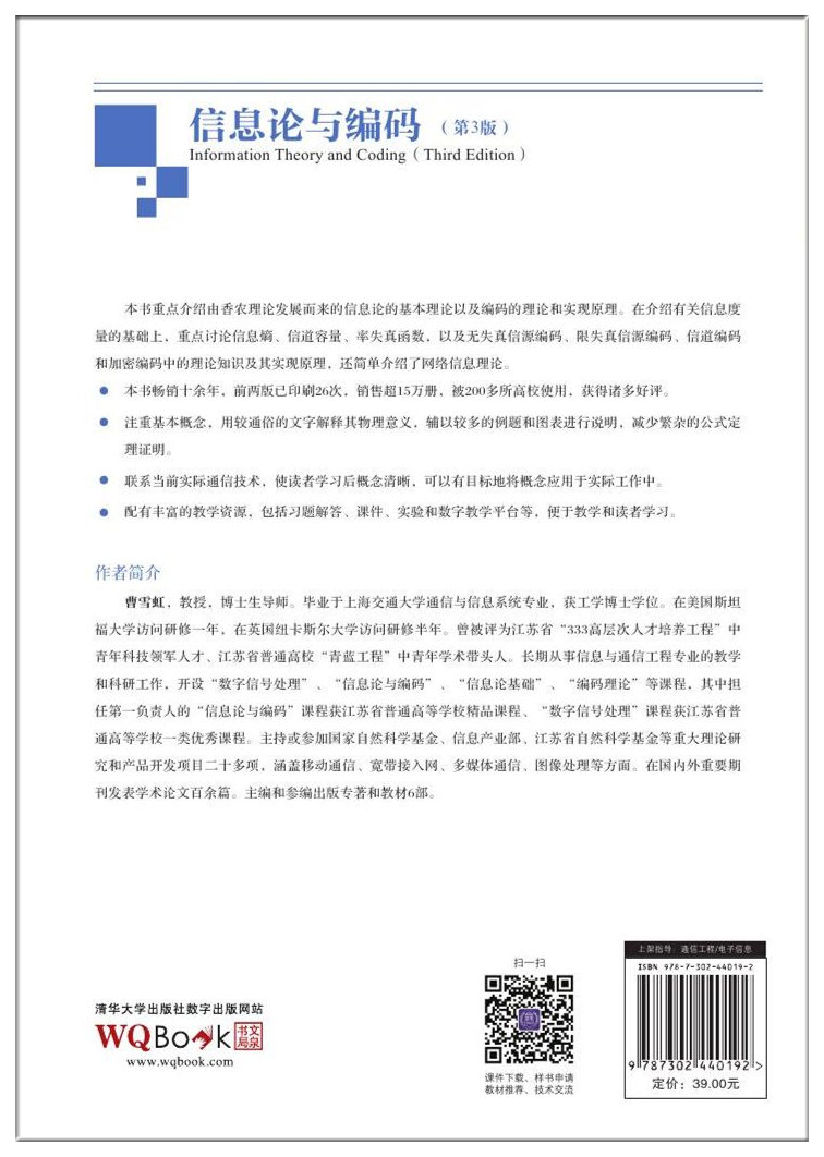 再版说明 本教材于2004年3月首次出版,于2009年2月再版,是普通高等教育“十五”国家级规划教材,入选“十二五”江苏省高等学校重点教材。 随着电子信息类本科专业在全国高校中开设的数量不断增加,“信息论与编码”作为这些专业必修的核心课程,教材的需求量不断上升,销售面不断扩大,教材目前已被国内包括985、211高校在内的200多所高校采用,累计印刷26次,累计销售超过15万册。 十多年来,我们得到了广大教师和同学们的热诚关心和帮助,他们对教材提出了许多宝贵的意见和建议,在此表示衷心的感谢。为了紧跟科学技术和信息理论的飞速发展,我们对教材的内容进行了部分增减,对某些不妥之处进行了修改完善,形成了第3版。 真诚欢迎广大读者对书中的错误和不当之处予以批评指正。 编者2016年3月