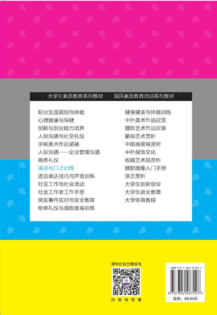 本书严格按照国家教育部关于“加强国民素质教育”的要求,结合大学生演讲与口才基本素质训练,系统介绍了演讲与口才训练的基本要求、思维训练、写作训练、用气发声技巧、演讲实用技巧、演讲应注意的问题等需要掌握的必备知识。 本书具有知识系统、内容丰富、贴近实际、注重创新、有操作性、强化素质培养等特点,并针对演讲与口才表达能力的提升配有大量拓展训练方案,既可作为普通高等院校学生演讲与口才训练的首选教材,也适用于企业员工培训,并为大学生就业、创业和社区工作者提高语言表达能力及交际水平提供学习指导。