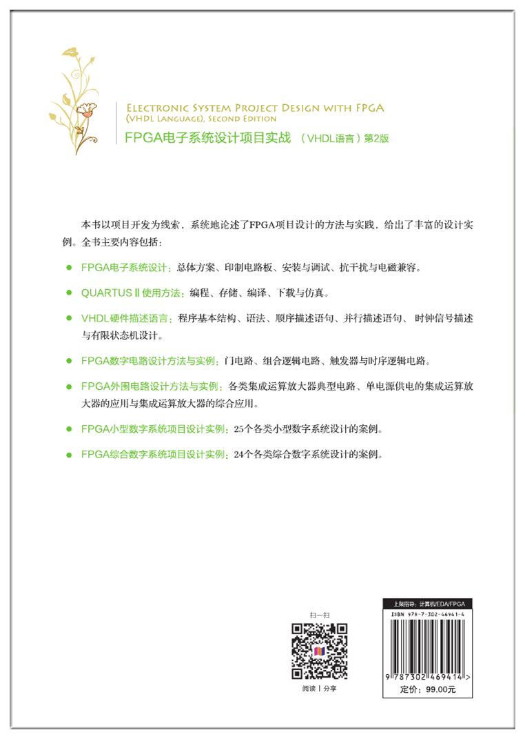 本书以项目开发为线索,系统地论述了FPGA项目设计的方法与实践,给出了丰富的设计实例。全书主要内容包括: l FPGA电子系统设计:总体方案、印制电路板、安装与调试、抗干扰与电磁兼容。 l QUARTUSⅡ使用方法:编程、存储、编译、下载与仿真。 l VHDL硬件描述语言:程序基本结构、语法、顺序描述语句、并行描述语句、 时钟信号描述与有限状态机设计。 l FPGA数字电路设计方法与实例:门电路、组合逻辑电路、触发器与时序逻辑电路。 l FPGA外围电路设计方法与实例:各类集成运算放大器典型电路、单电源供电的集成运算放大器的应用与集成运算放大器的综合应用。 l FPGA小型数字系统项目设计实例:25个各类小型数字系统设计的案例。 l FPGA综合数字系统项目设计实例:24个各类综合数字系统设计的案例。