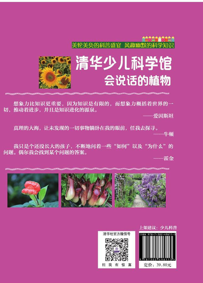 当我们置身于五彩缤纷的植物世界时,我们就会发现,植物王国竟然如此奇异和美丽!那里有着太多的奥妙和生趣,不经意间我们就会喜欢上这些可爱的植物精灵。它们有自己的“族谱”,它们也有属于自己的智慧,甚至,它们也会“说话”,它们中有的食肉成性,有的肆意侵略,有的是人类的朋友,有的也会对人类的健康甚至生命造成威胁……所以,我们只有走近它们,熟知它们的秉性,才能真正地读懂它们。 ??本书是一本关于植物的科普读物,除了加插了许多精美的插图外,本书还从植物的生存技能、神奇的花草、植物的怪异行为,到植物的世界之最四个方面试着去探索、了解植物世界的小秘密,我们在每一节的后面都精心为读者提供了有关植物的神奇的小贴士,帮助小朋友进一步了解,更好地认识和关爱我们的大自然。小朋友也会重新认识植物与我们人类生活的密切关系,拥有一个正确对待大自然的观念。我们相信,这些流着绿色“血液”的朋友们,也有着它们独特的生活。 ??有趣吧!在植物的大花园里还有很多让人感到不可思议的自然现象。我们将带你进入缤纷灿烂的植物世界。现在就出发吧!