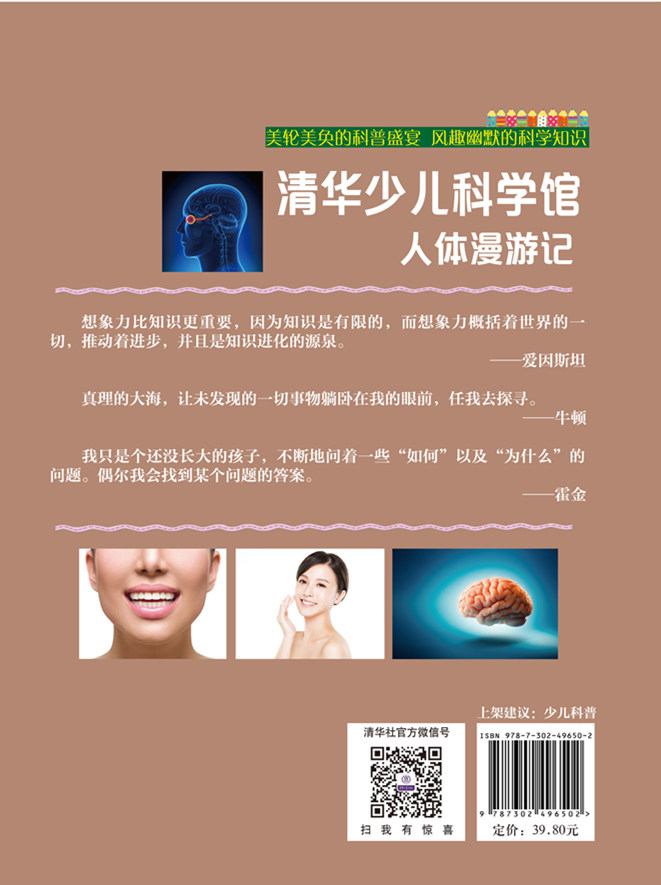 我们对人体是既熟悉又陌生,熟悉是因为每天都能看到,陌生是因为并不了解。人体就像一个庞大的机器,维护其正常运转的各种器官发挥着各自的功能,完美地履行自己的职责。 小朋友们都有着强烈的好奇心、求知欲和探索精神,而人体本身的形态结构、机能与生命活动,如生长、发育、健康、疾病、信息的感知与处理等,对他们而言都充满着趣味性和神秘感。现在的小朋友知识面宽广,不仅对科学和文化知识感兴趣,而且对人体本身的奥秘也很感兴趣。 为了满足孩子们的求知欲,我们精心编写了这本《人体漫游记》。本书包括了头脑、五官、人体内部结构和皮肤毛发四个章节的内容,涵盖了人文科学、常识类的知识以及现代科学的知识,形象生动,具体有趣,更揭秘了诸多奇怪的现象。每一节都设计了“你知道吗?”栏目,充分激发青少年探索奇妙世界的兴趣和 热情。 赶快跟随本书一起去探索人体吧!