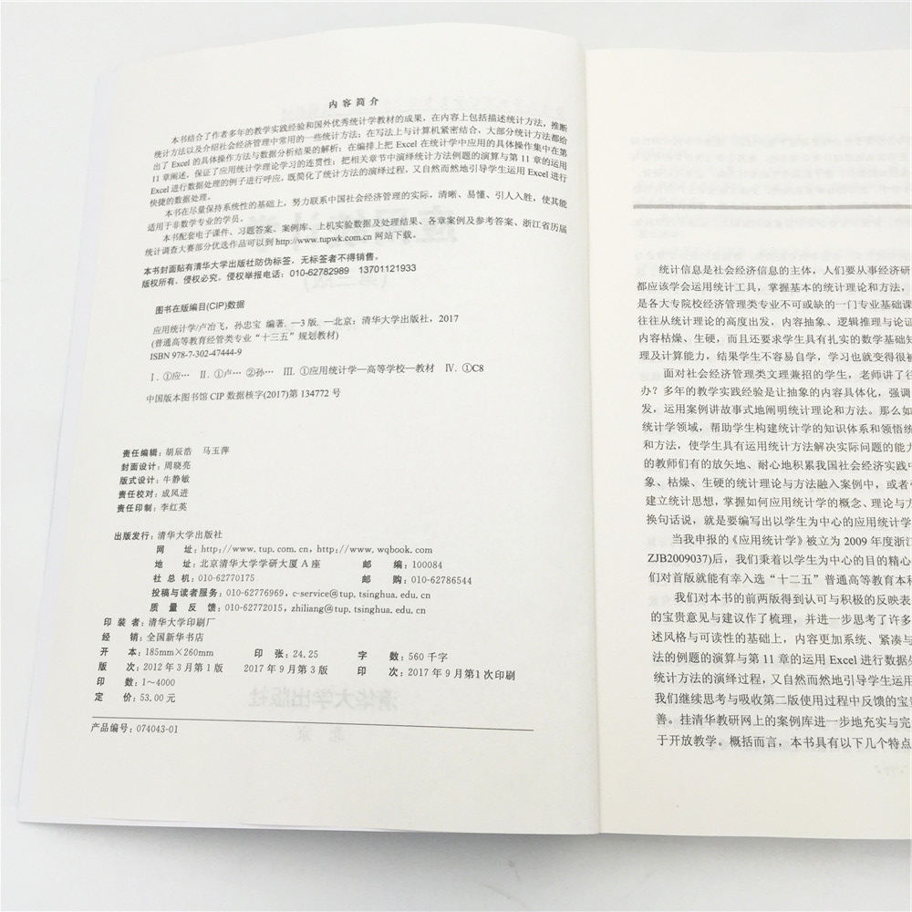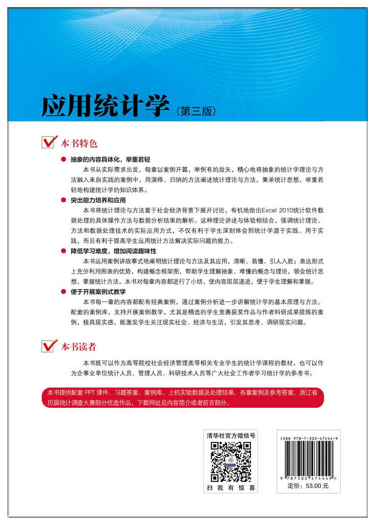 用统计基本理论与方法来解决实际问题的能力。精选的配套案例题与挂清华教研网上的从易到难的三级案例库,能支持教师开展案例教学,尤其是精选的学生统计调查研究竞赛获奖作品与作者科研成果提炼的案例,极具现实感,能激发学生关注现实社会、经济与生活,引发思考、调研现实问题。
